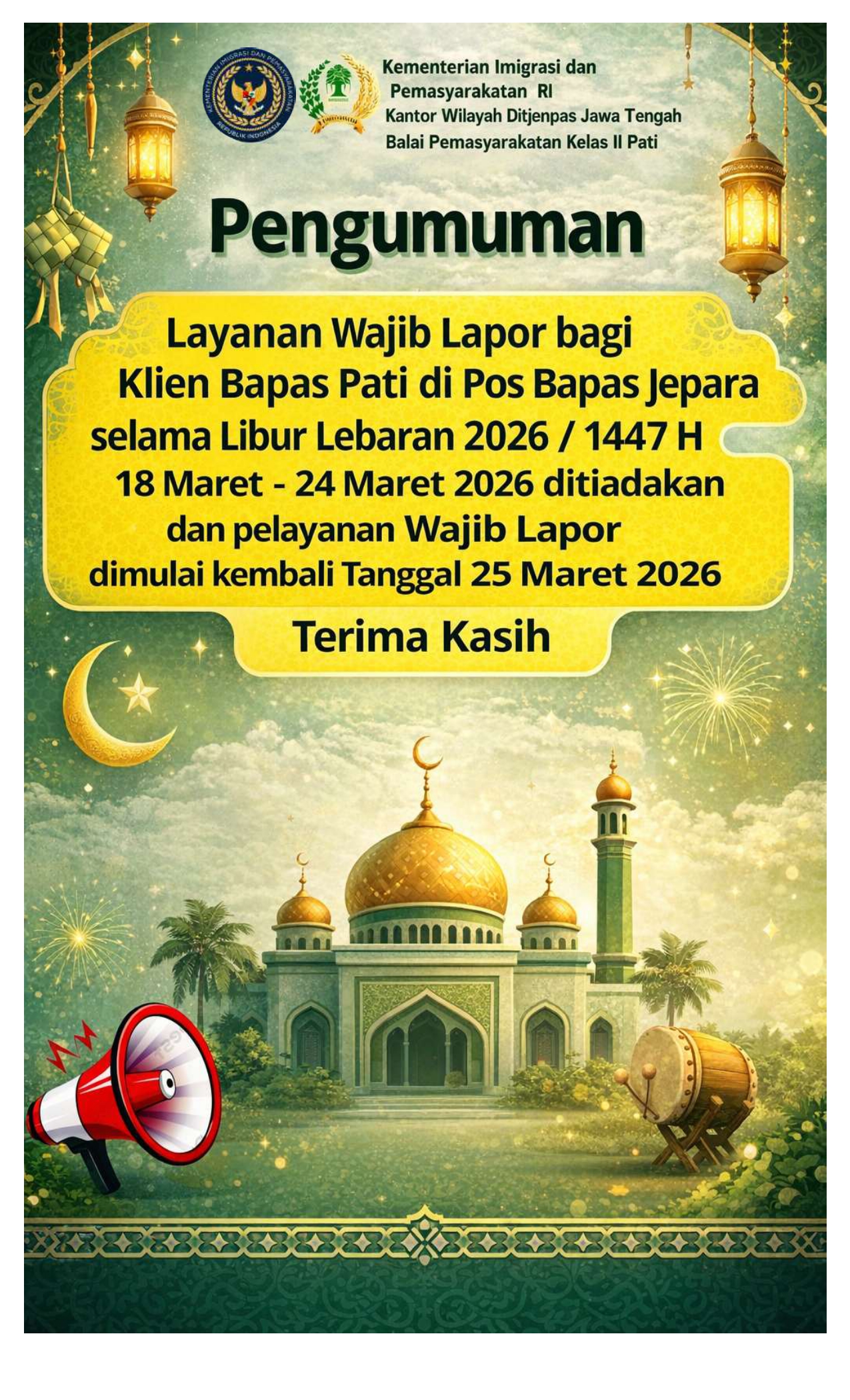 Pos Bapas Jepara Mengucapkan Selamat Hari Raya Idul Fitri 1447 H. Kegiatan Layanan Wajib Lapor Selama Libur… Pos Bapas Jepara